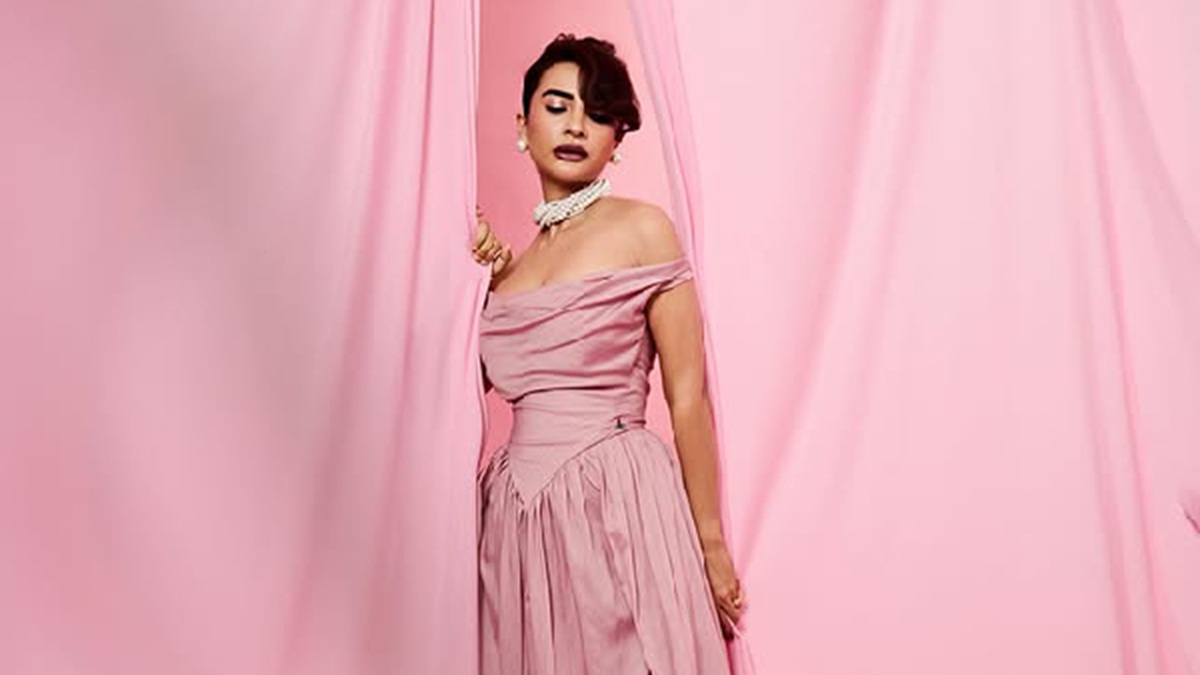 Draped in a delicate blush-toned off-shoulder dress, Patralekhaa channels old-world elegance. The soft pleats, pearl jewellery, and vintage-inspired hairstyle create a timeless, almost cinematic feel that highlights her graceful side.