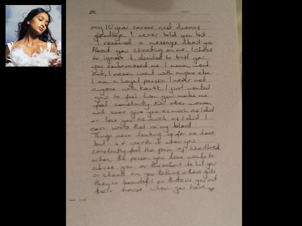 The note further read, "I have no reason to breathe anymore. All I wanted was love. I did everything for you. I was working for us. But you were never my partner. My future is destroyed my happiness snatched away from me. I always wished the best for you, was ready to invest what little money I had in your betterment. You never appreciated my love, Kicked me in the face. I have no confidence or self esteem left, whatever talent whatever ambition you took it all away. You destroyed my life. It hurt me so much that I waited for you for ten days and you didn't bother buying me something."