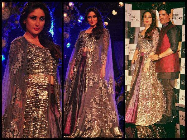 Bollywood actress Kareena Kapoor Khan and Varun Dhawan were the showstoppers for designer Manish Malhotra at the Lakme Fashion Week (LFW) 2014. It is indeed a memorable day for Kareena when she walked the ramp as showstopper and dazzled on stage.