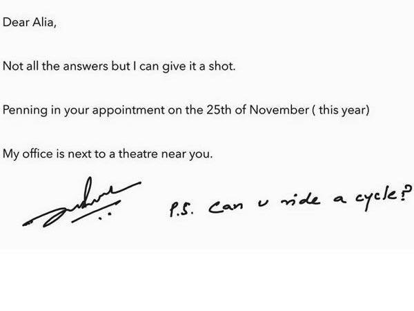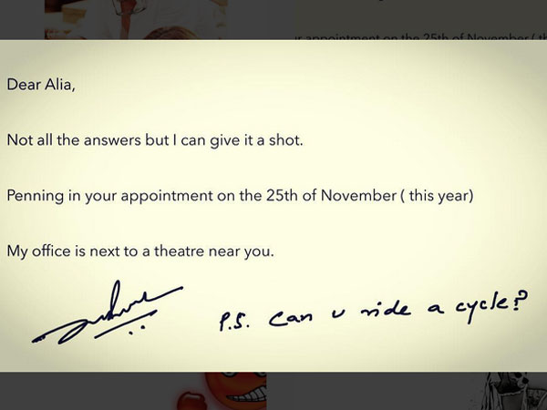 Here's a sample of one letter which read, "Dear Zindagi, There's only one thing that keeps me from tearing my boyfriend into half.... I don't want two of him around!!!! Alia."