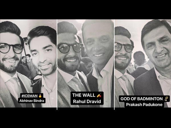 Ranveer Singh got the opportunity to bond with Deepika Padukone's father Prakash Padukone at the launch of 'Padukone-Dravid Centre for Sports Excellence' [PDCSE] and posted Instagram stories with Prakash Padukone, Rahul Dravid, Abhinav Bindra, Vishwanathan Anand and Geet Sethi.