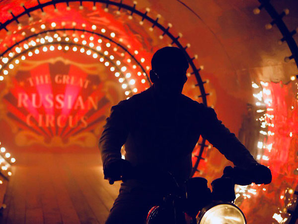 Ali Abbas Zafar shares a new still from Bharat and it shows Salman Khan riding a bike in the circus. The still is dark and Salman's face isn't visible. The backdrop reads 'The Great Russian Circus'.