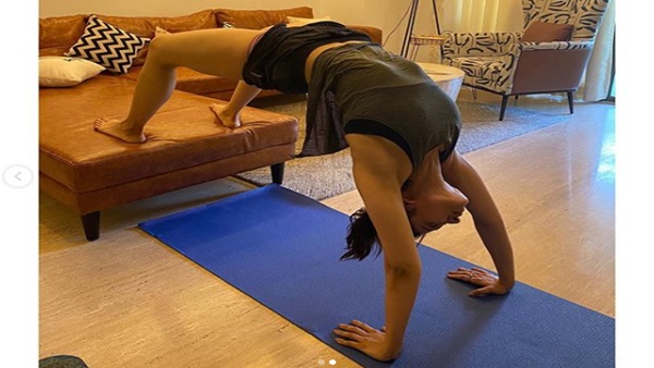 Actress Rakul Preet Singh recently shared a couple of pictures of herself working out at home with the use of furniture. She captioned the snaps, "excuses never burn calories who knew home furniture makes for the best props . don't let #self quarantine stop your growth . Do things that you never found the time for !! #yogahacks."