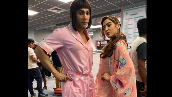 Talking about the same, Varun Dhawan and Sara Ali Khan can be seen posing side by side in the picture. While Sara can be seen sporting a peach-coloured floral-printed traditional attire, Varun can be seen wearing a nurse's pink attire and can be seen with a stylish hairdo and makeup. The Student Of The Year actor not only looks unrecognizable but also looks rather pretty in this female look.