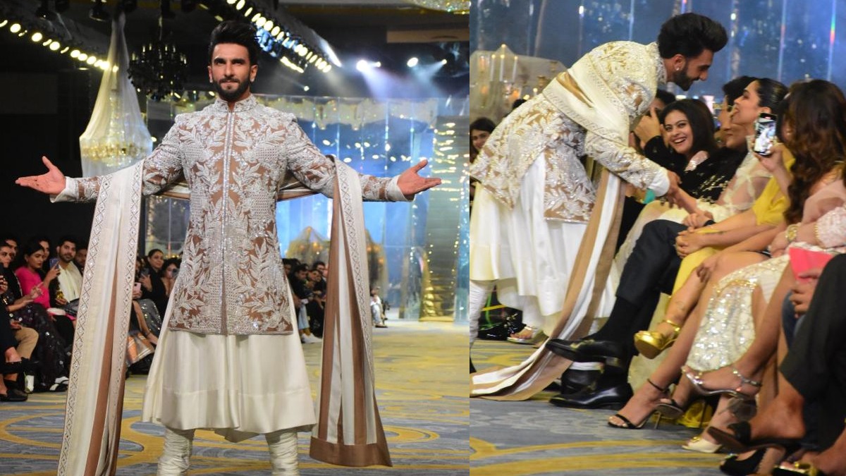 He was seen wearing a white sherwani along with a glittery floral printed jacket and looked every bit regal. And while Ranveer made a dhamakedar entry on the ramp, he paused at the ramp and walked towards his ladylove and made sure to kiss her.
