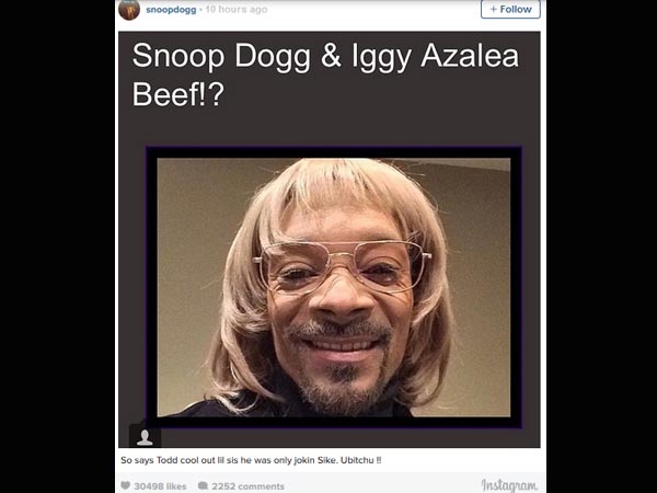 Snoop Dogg and Iggy Azalea's fight is getting ugly as both the singers are trying hard to diss each other. The rapper has taken his Internet feud to a higher level in Round 3. After Iggy slammed Snoop Dogg, he posted again on Instagram. This time he posted a pic of himself wearing a platinum blonde wig under the words: "Snoop Dogg & Iggy Azalea Beef!?" In the bottom of the pic, he wrote, "So says Todd cool out lil sis he was only jokin Sike. Ubitchu !!"