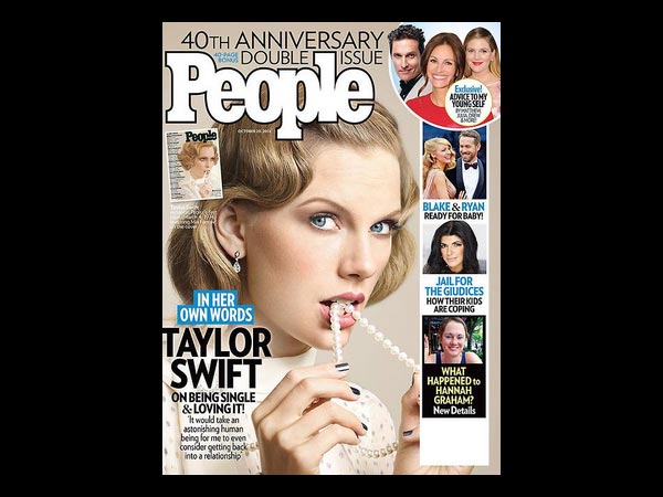 The magazine cover reads, "In Her Own Words: Taylor Swift On Being Single & Loving It." Talking about her love life, Taylor Swift said, "I'm not going to compromise the happiness and independence that I've found for just anybody. The idea of a date gives me a partial panic attack!"