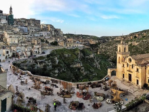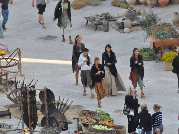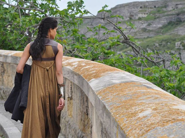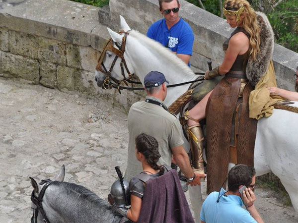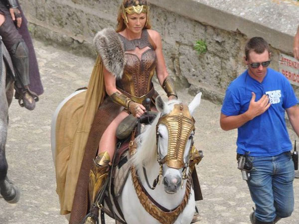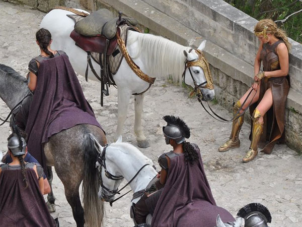 The castles and buildings shot in Matera are real, and are not sets . The costumes are lavish and very knightly. The Queen is on her horse strolling past her castles possibly have a surveillance or a discussion with her knights. Nevertheless, the shots look nothing but stunning. Gal Gadot plays the title role of Wonder Woman aka Princess Diana.