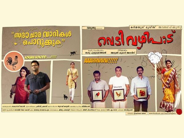 Another highlight of the movie is that, Vedivazhipadu has no songs in it. The movie is directed by Shambhu Purushothaman. Indrajith, Murali Gopy, Mythili and Anusree play lead roles in this movie. Arun Kumar Aravind, director of One By Two is the producer of the movie. Other cast include Saiju Kurup, Anumol and Sreejith Ravi. The movie is produced under the banner of Karmayug Movies.