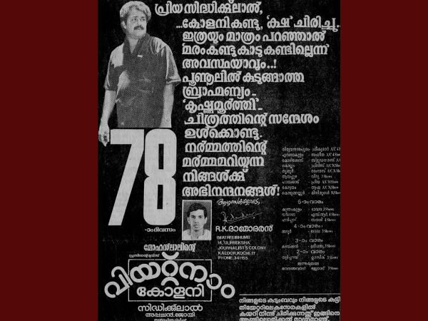 He slowly changed his track into protagonist roles after a series of antagonist and supporting roles, with the lead role in Poochakkoru Mookkuthi, directed by his best pal, the veteran film-maker Priyadarshan.