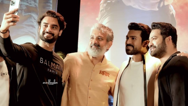 Tovino Thomas, who was visibly excited to share the stage with SS Rajamouli, Ram Charan, and Jr NTR, expressed his happiness while addressing the audience. The Minnal Murali actor also wished the RRR team all the best for the grand release of the highly anticipated film.