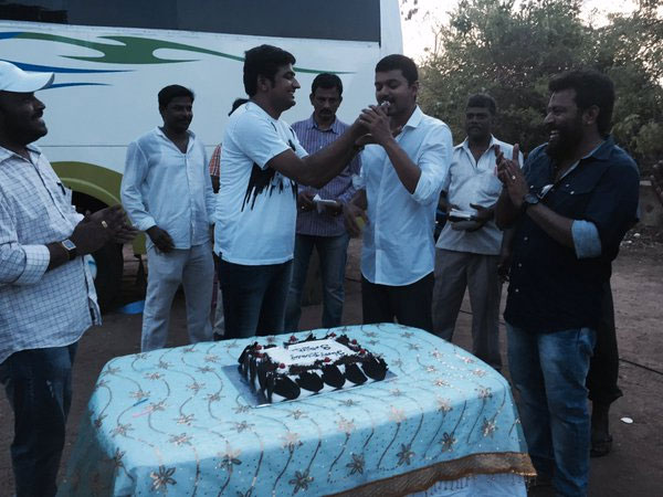 While shooting for Vijay 60, which is being directed by Bharathan of Azhagiya Tamil Magan fame, the entire team gathered to wish Sathish.