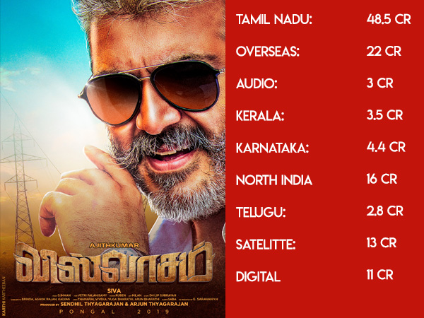 Now, here is some for good news for all you Ajith fans out there. Viswasam has done some fabulous pre-release business and emerged as a profitable venture for the producers Sathya Jyothi Films. According to a popular youtube channel, the film has collected nearly Rs 124 Crore through pre-release business. The table profit is around Rs 30 Crore.