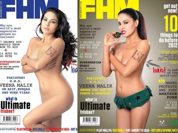 The FHM's latest cover page shows topless Veena Malik covering her twin assets with her left arm with the ISI tattoo on the arm. In the picture, the Pakistani actress is pinning off a grenade with her right hand. The below portion of her waist is covered with a green thong. The shocking aspect of the cover is that an arrow pointing towards the tattoo says, “ISI hand in end of the world too?"
