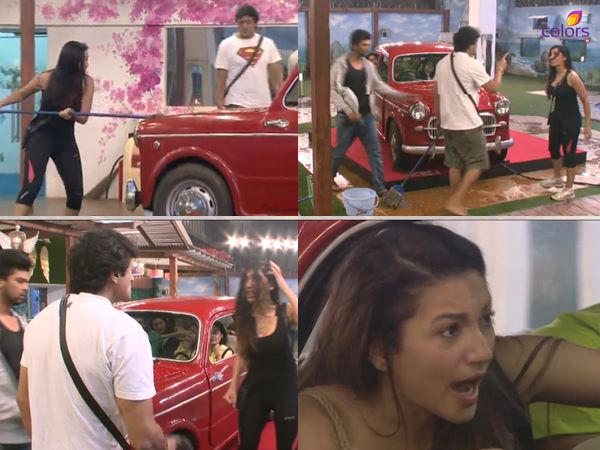 During this, Sofia decides to have some fun with the people in the car and starts splashing the car with dirty water using a mop. Armaan, who assumed that she was aiming Tanisha (who was sitting in between Kamya and Ajaz) and decided to stop her. In the process of which he "accidentally" hurt her with the mop they were fighting for. Later, Kushal and Armaan fight (again) on this issue.