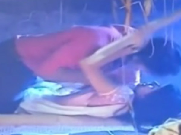 When Raja tries to get closer to Rani again, she hits him with a rod and tries to escape. Raja falls on a lantern and a glass pricks him. Rani, who has a soft corner for Raja, does the first aid.
