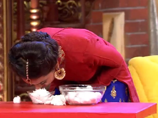 She also makes Lakshya and Ragini play the game with cotton, and one who loses the game would get a kiss from her! Ragini wins the game, while Lakshya gets Mangala's kiss.