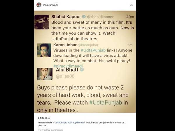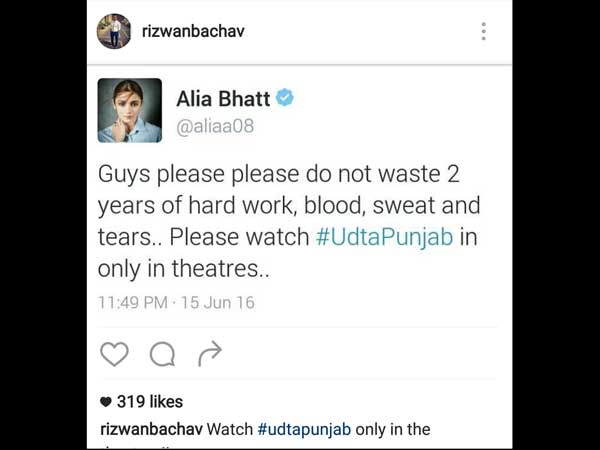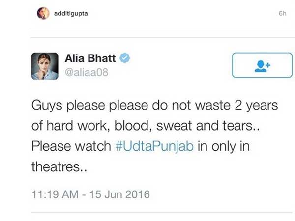 Alia said in her tweet, "Guys please please do not waste 2 years of hard work, blood, sweat and tears.. Please watch #UdtaPunjab in only in theatres..," while Shahid tweeted, "Blood and sweat of many in this film. It's been your battle as much as ours. Now is the time you can show it. Watch UdtaPunjab in theatres."