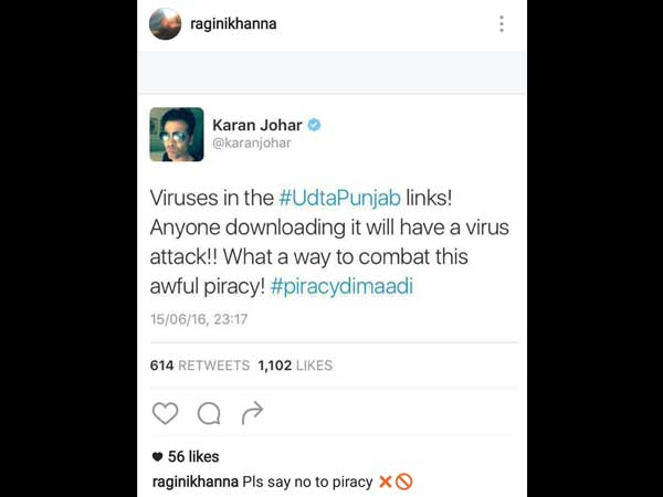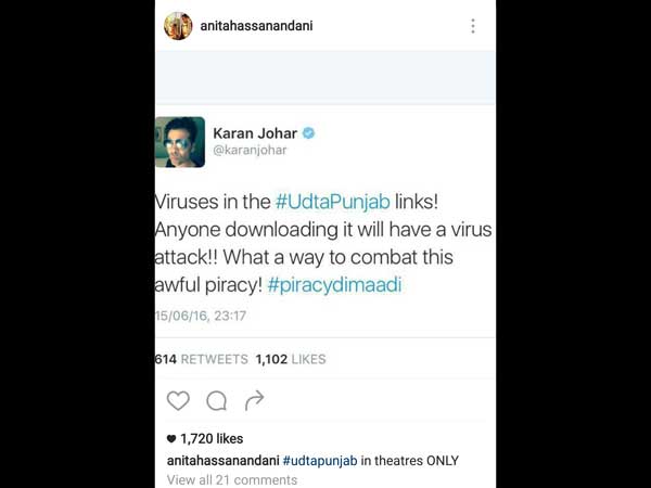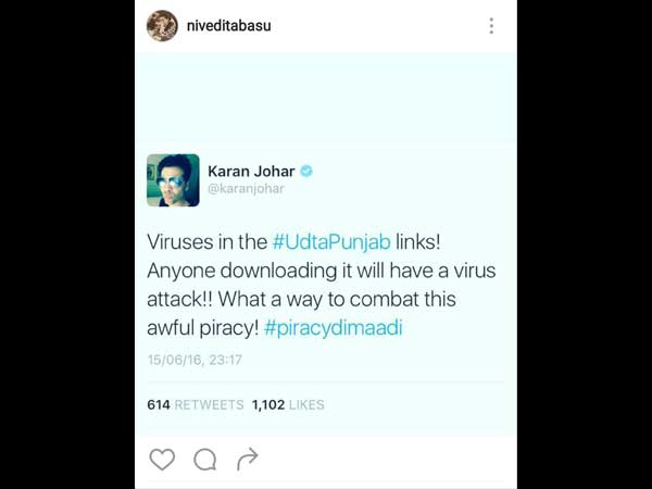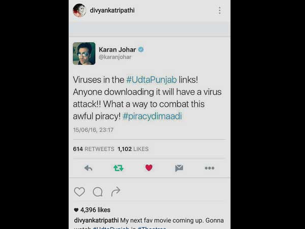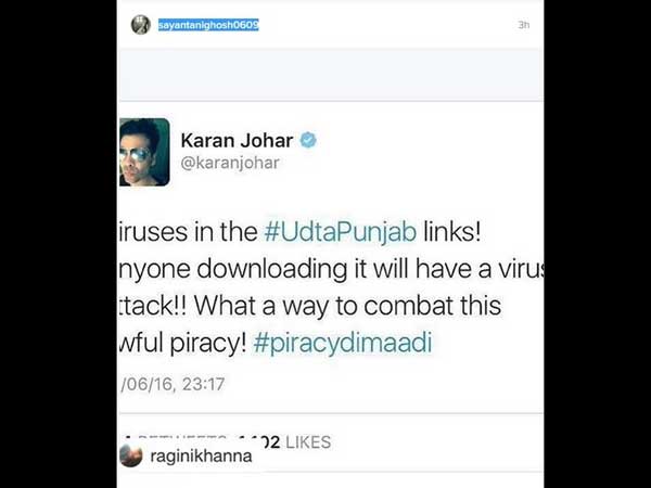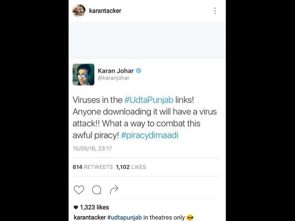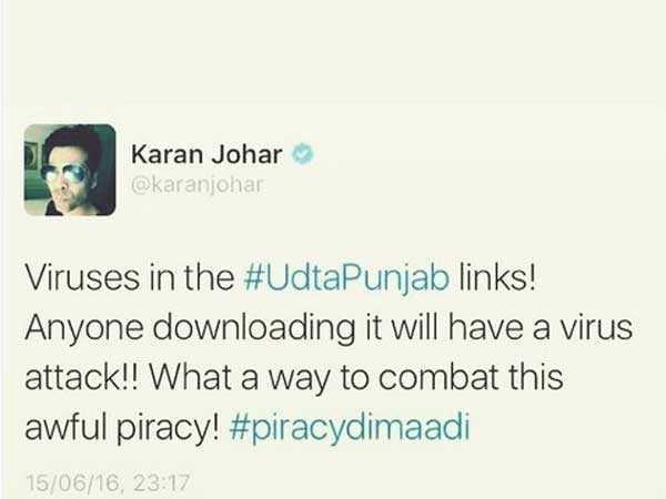 India's Got Talent Judge, Karan Johar's tweet said, "Viruses in the #UdtaPunjab links! Anyone downloading it will have a virus attack!! What a way to combat this awful piracy! #piracydimaadi."