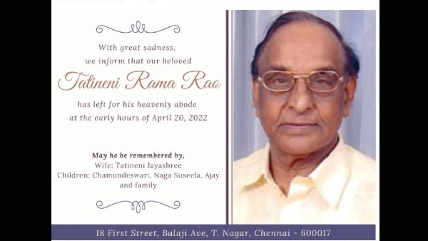 The statement read as, "With great sadness, we inform that our beloved Tatineni Rama Rao has left for his heavenly abode at the early hours of April 20, 2022. May he be remembered by wife Tatineni Jayashree and children Chamundeswari, Naga Suseela, Ajay and family."