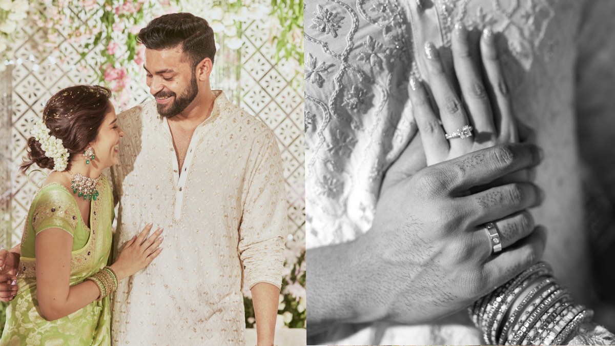 She tied her knot in a low bun and put a string of jasmine flowers around it, in a south-Indian style. The actor and actress showed off their engagement rings in a set of pictures they posted online.
