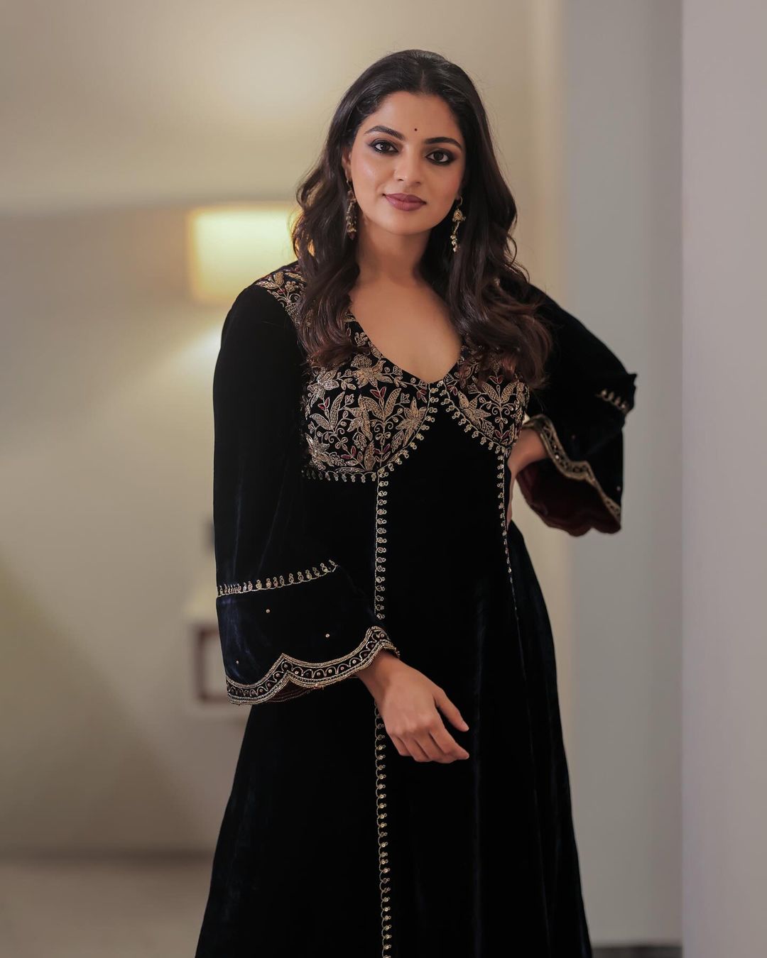 Nikhila looks breathtaking in this black velvet salwar suit, captivating everyone's attention.